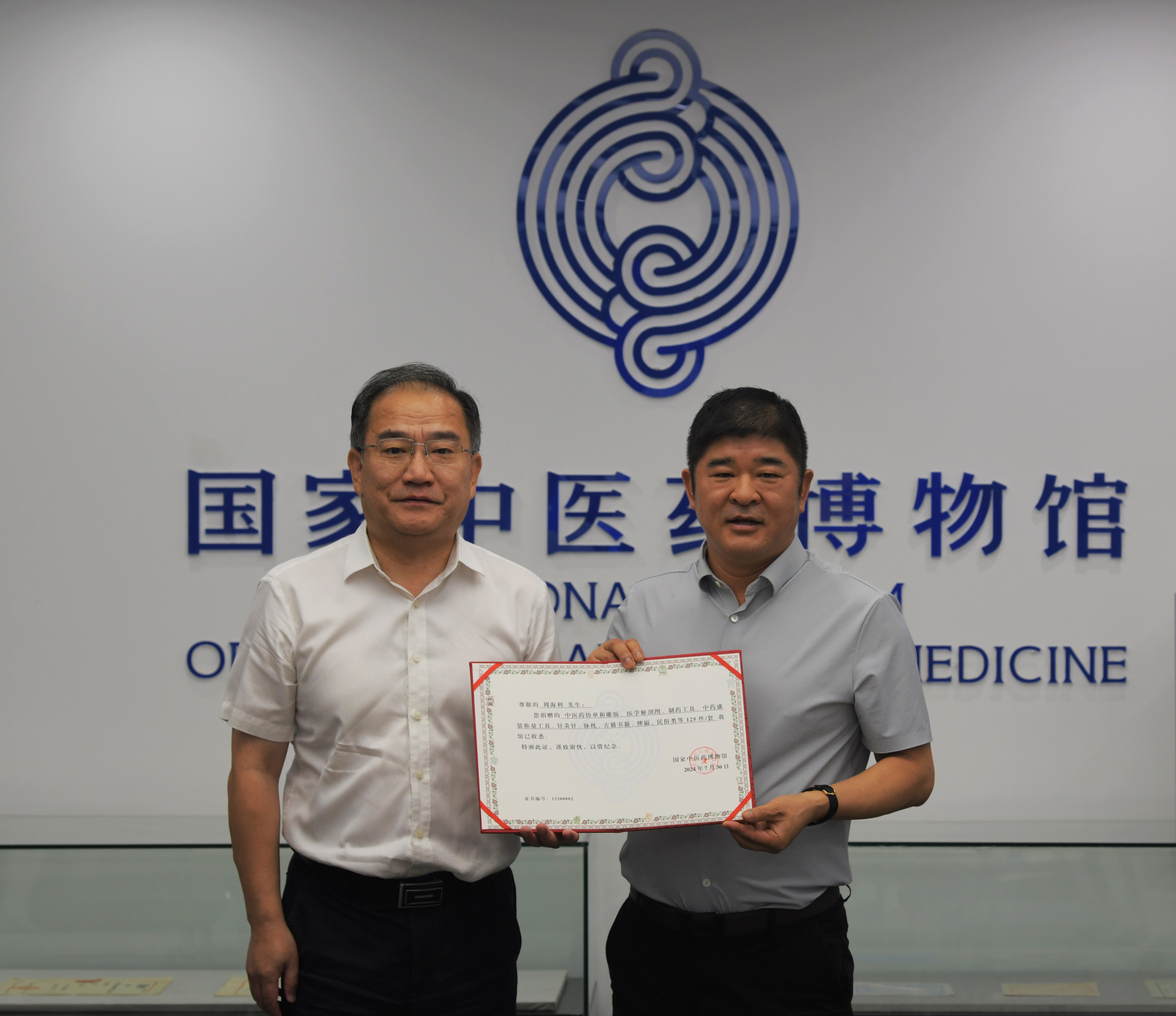 7月17日上午,国家中医药博物馆举行捐赠仪式,北京周氏时珍堂药业有限公司党支部书记、董事长,北京东璧堂中医药博物馆馆长周海利将个人收藏的125件/套与中医药相关的藏品无偿捐赠给国家中医药博物馆。馆长杨荣臣出席。