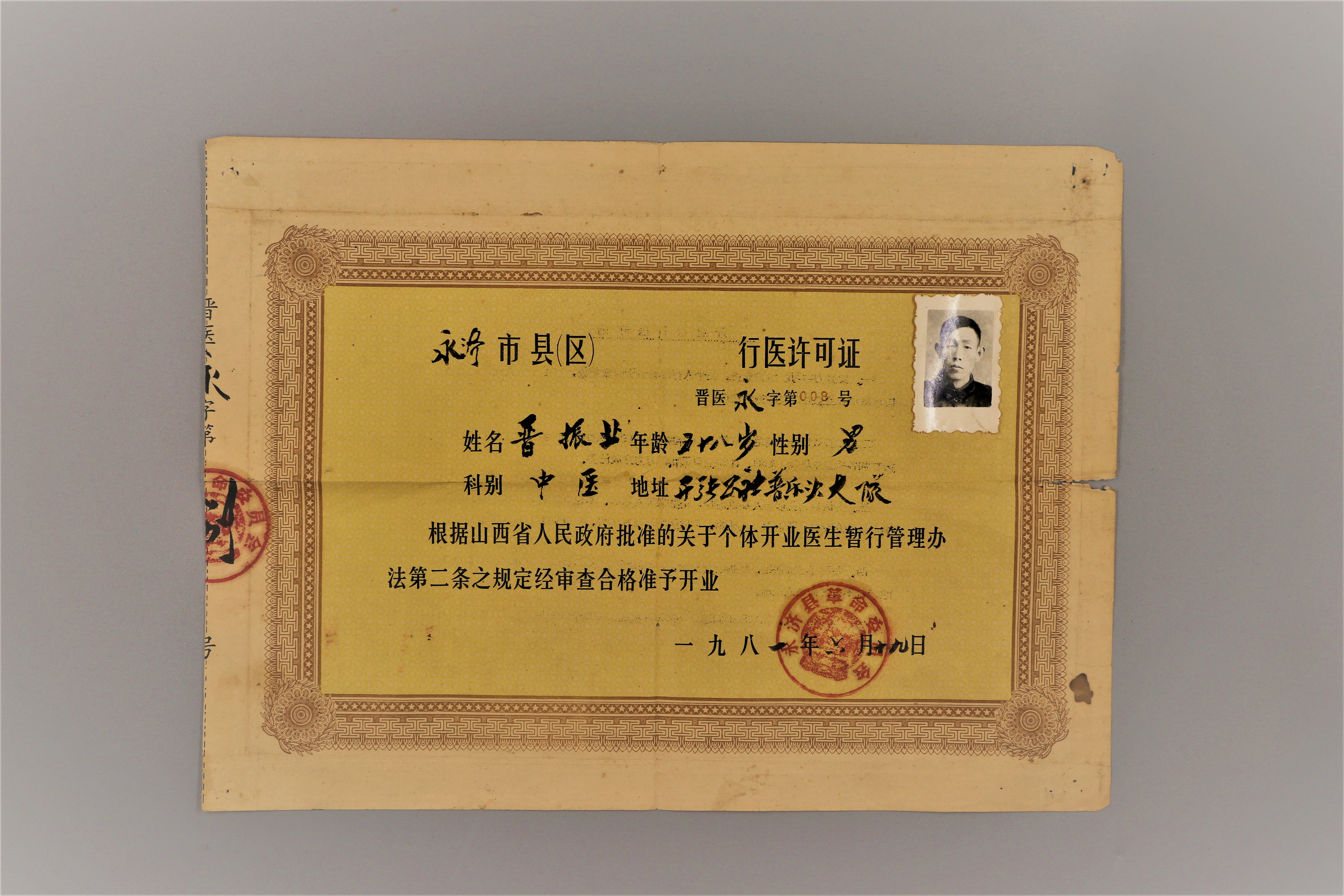 晋振业永济县行医许可证