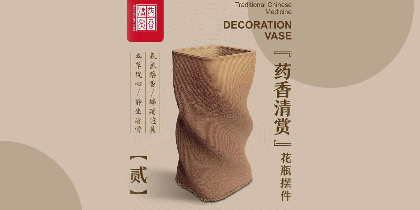 选取十余种芳香中药材,按照“君臣佐使”中医组方原则配伍,配成“芳香辟秽”“提神醒脑”“安神助眠”三个组方,参考传统制香工艺,依托现代3D打印技术,制作出花瓶系列摆件。本产品造型似传统瓷器瓶型,可作为花瓶或摆件置于室内,供观赏的同时还散发着悠悠药香,根据配方不同可起到多种功效,既有实用性,又具观赏性,还有养生功效,在赏心悦目的同时,有益于身体健康。