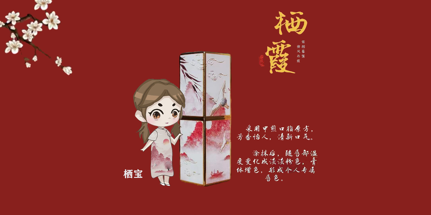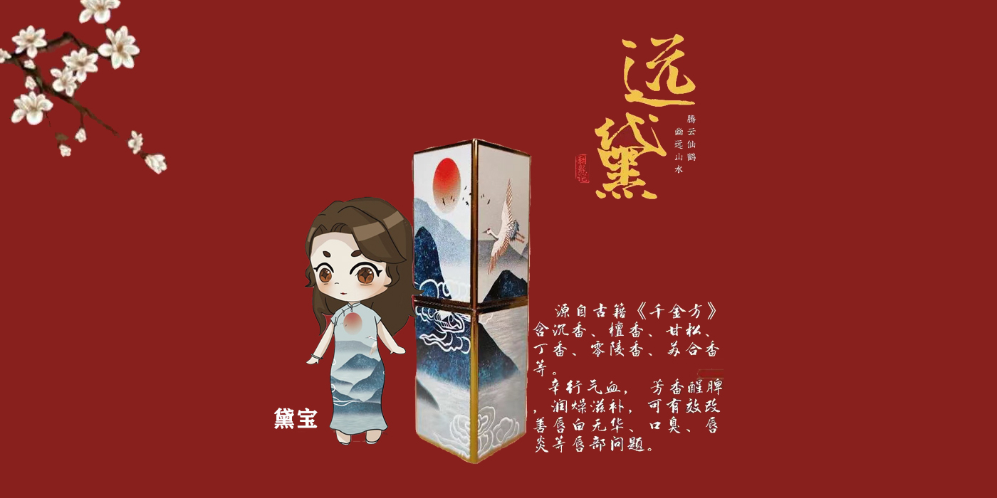 三款国风系列中药润唇膏——远黛、栖霞、芊寻,以《千金方》中甲煎口脂为原方进行改良,结合中药复方,唇膏管外观进行喷绘,搭载文创设计,作为中药文创新载体,产品兼具实用与美观性。