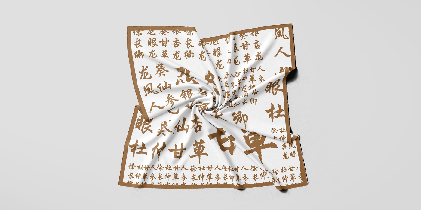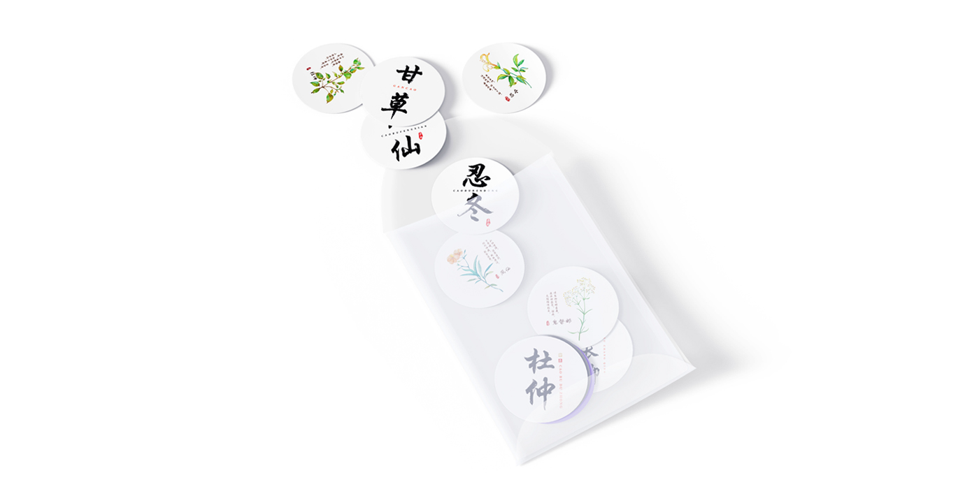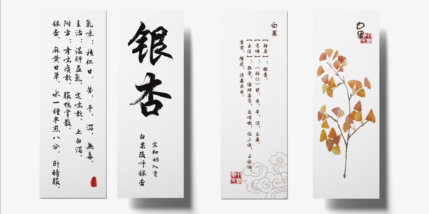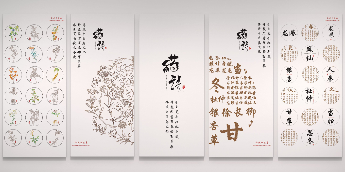 通过探究中医药命名与龙文化、避讳文化、古典文学、道教佛教文化、阴阳五行学说关系,挖掘蕴含的中医药命名文化及其美学思想。作品选取10味药材、共21个元素,分别为:龙文化(龙葵、龙眼);避 讳文化(凤仙、银杏);阴阳五行学说(甘草、杜仲);道教佛教文化(人参、徐长卿);古典文学(忍冬、当归),归纳总结其命名文化来源、特性等。字体选用行书,不仅体现了草本的特性,还透露出“灵气”的韵味,同时行书的字法、结构、章法与中医药相得益彰。药材图形表达方面选用水彩绘画,不仅美观也易于中医药文化传播。