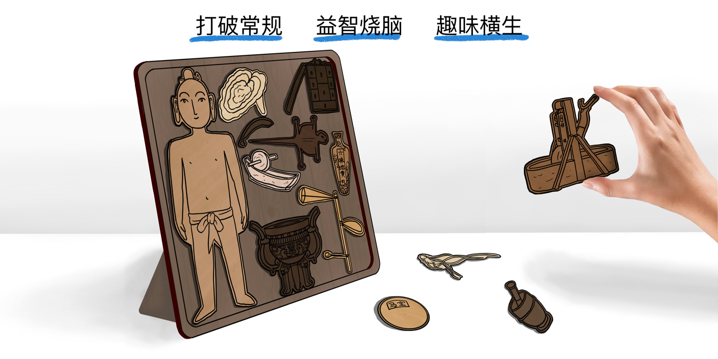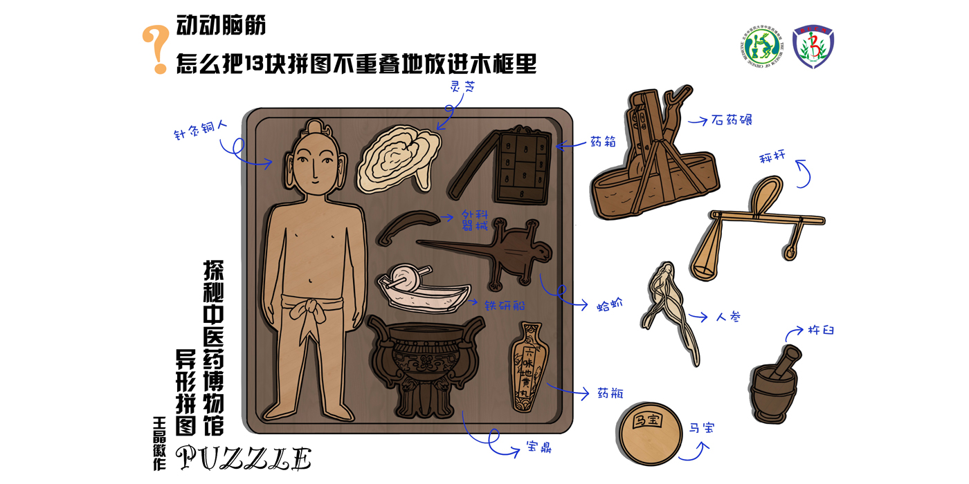 拼图包括针灸铜人、石药碾、药箱、秤杆、药瓶、杵臼、铁研船、古代外科器械、宝鼎、马宝、蛤蚧、人参和灵芝,其原型全部来自北京中医药大学博物馆的藏品,能够充分宣传特色藏品,也能彰显中医药文化底蕴,吸引更多参观者的到访。