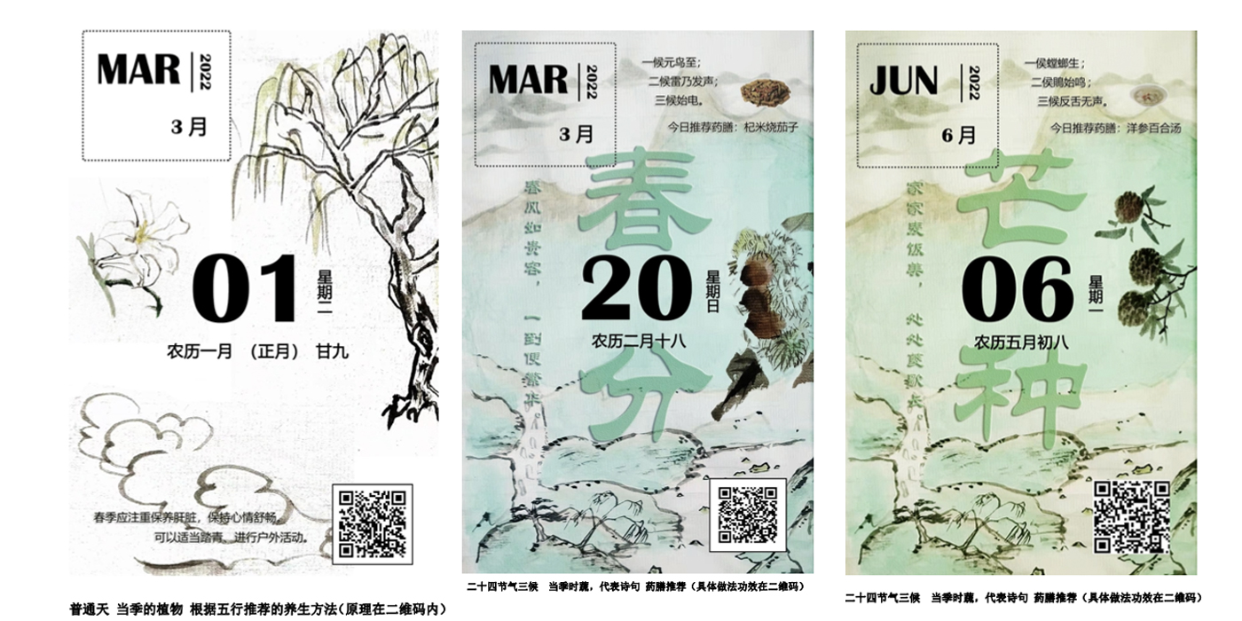 “至微”中医养生日历是一款创新性融合了中医五行与药膳的文创类产品,在普通日历的基础上,为使用者提供基于中医药理论指导的养生保健知识,扩大人群对中医的传播与了解,使得中医文化更加贴近日常生活。“至微”取自成语“无微不至”,旨在细致周到的服务,顺应天人合一,四时变化,在不同的季节时令推荐符合的药膳与果蔬,根据阴阳五行提出合理的生活方式,推荐简单的按摩穴位,符合当下人们的养生保健需求。日历在形式上也有所改变,用二维码呈现相关知识以节省空间,国风插画表现各类时蔬更添创意。在数字媒体的时代,我们将会把日历数字化,使这款日历传播范围更广,受益人群更多。