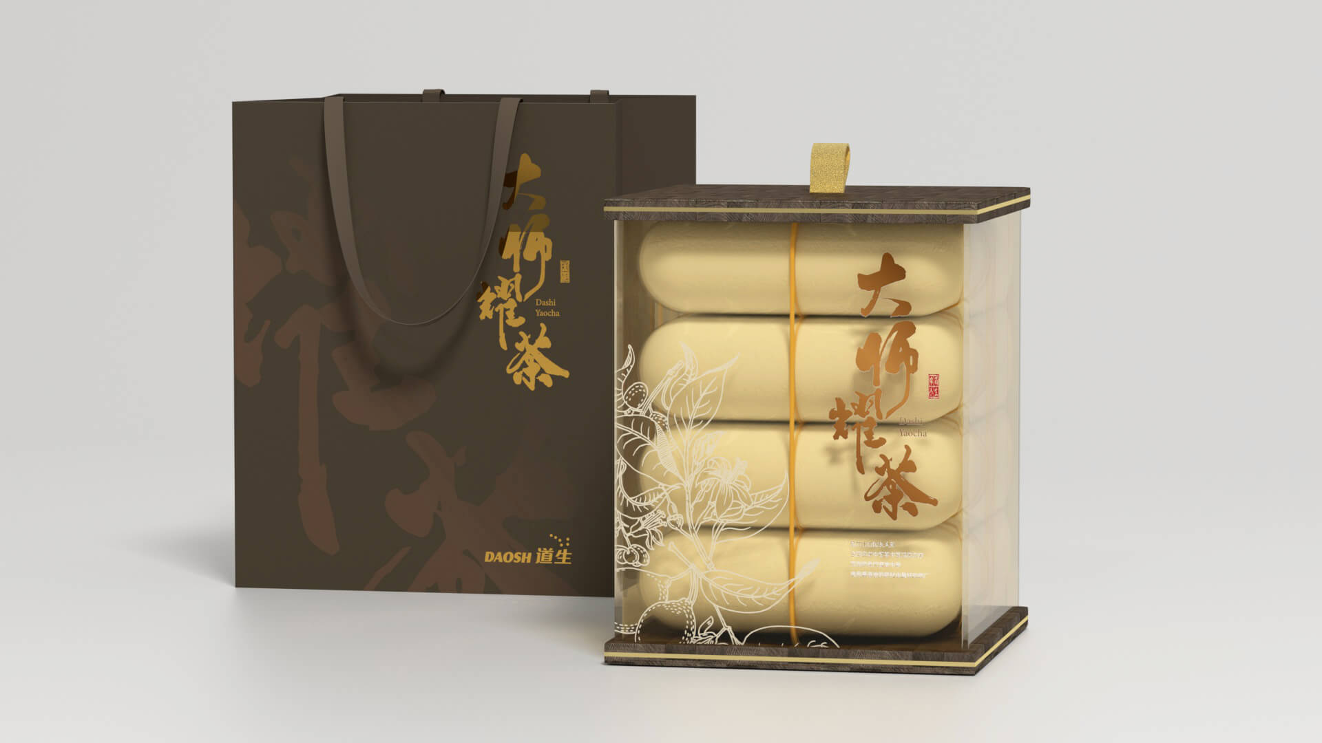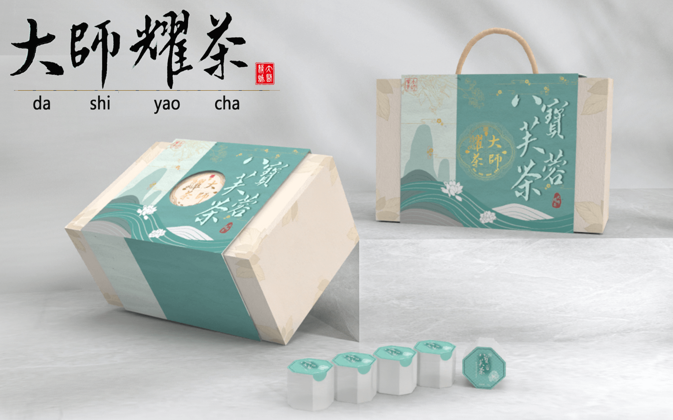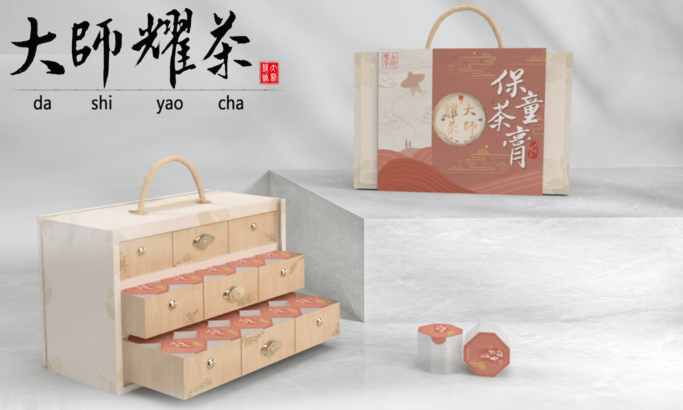 Logo在原有形式上重新设计,本草纹样托举logo主体,层次鲜明、重点突出;红色“大医精诚”印章增加色彩丰富度,传统文化韵味十足;“大师耀茶”书法与拼音,表现品牌名称;手绘人参代替“光”,体现品牌的中医药特色;代表道生的水滴与祥云纹变形外框,贯彻云水纹元素,使设计细节内外统一、更具系统性的同时,也将公司内涵融入到了logo表达之中。