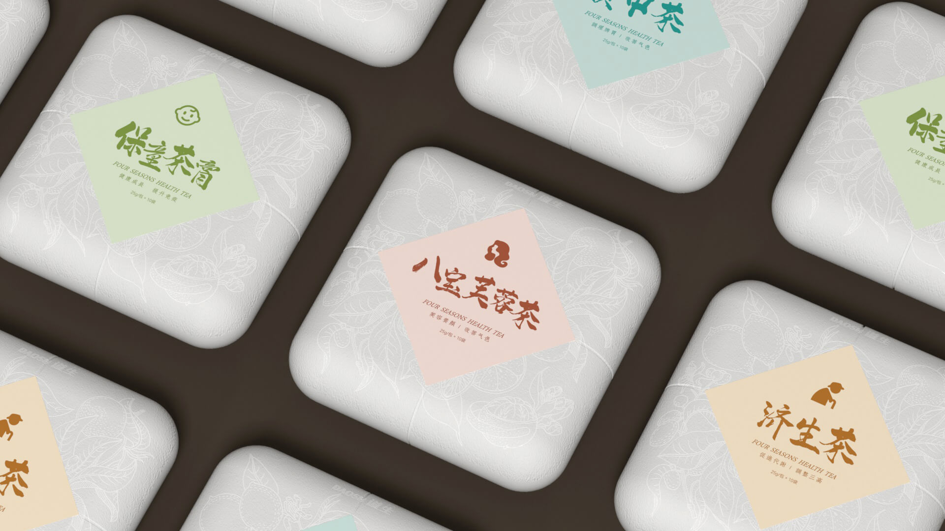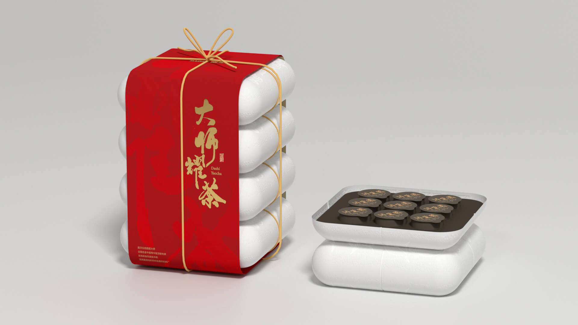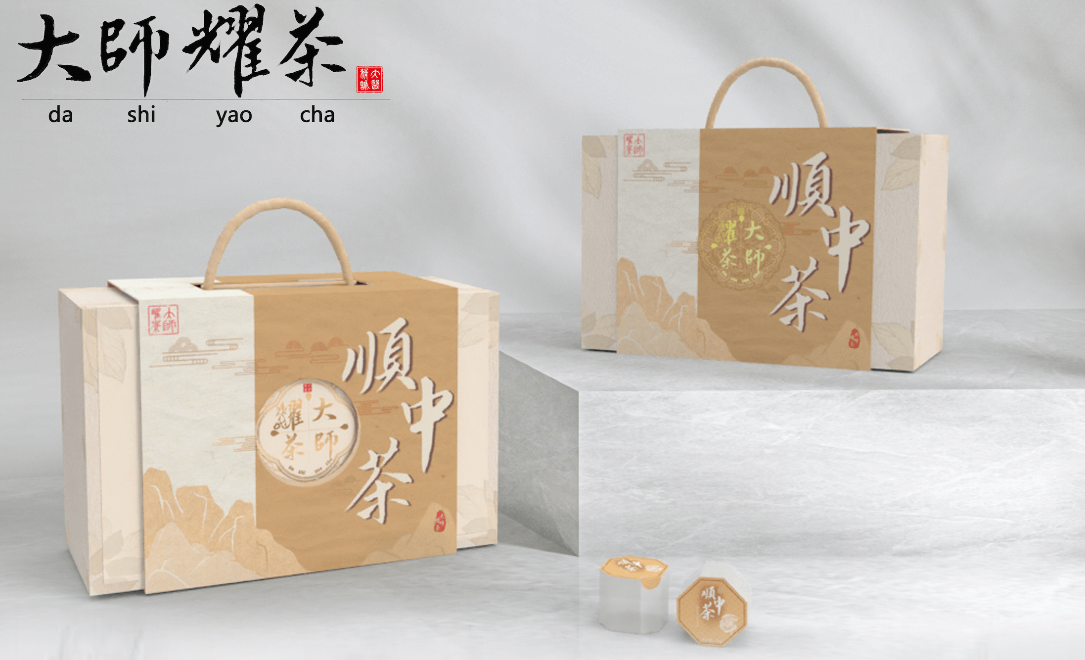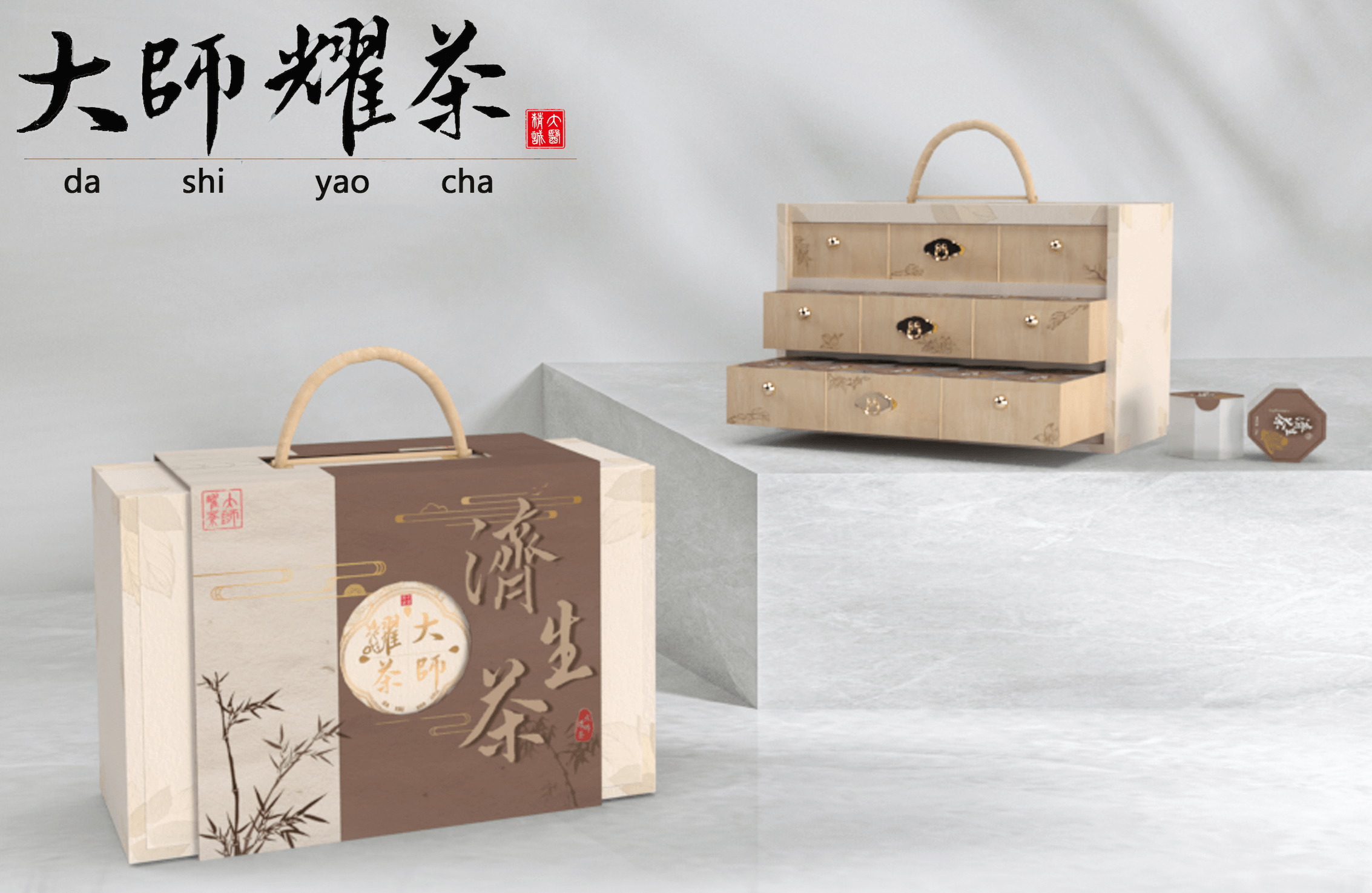 Logo在原有形式上重新设计,本草纹样托举logo主体,层次鲜明、重点突出;红色“大医精诚”印章增加色彩丰富度,传统文化韵味十足;“大师耀茶”书法与拼音,表现品牌名称;手绘人参代替“光”,体现品牌的中医药特色;代表道生的水滴与祥云纹变形外框,贯彻云水纹元素,使设计细节内外统一、更具系统性的同时,也将公司内涵融入到了logo表达之中。
