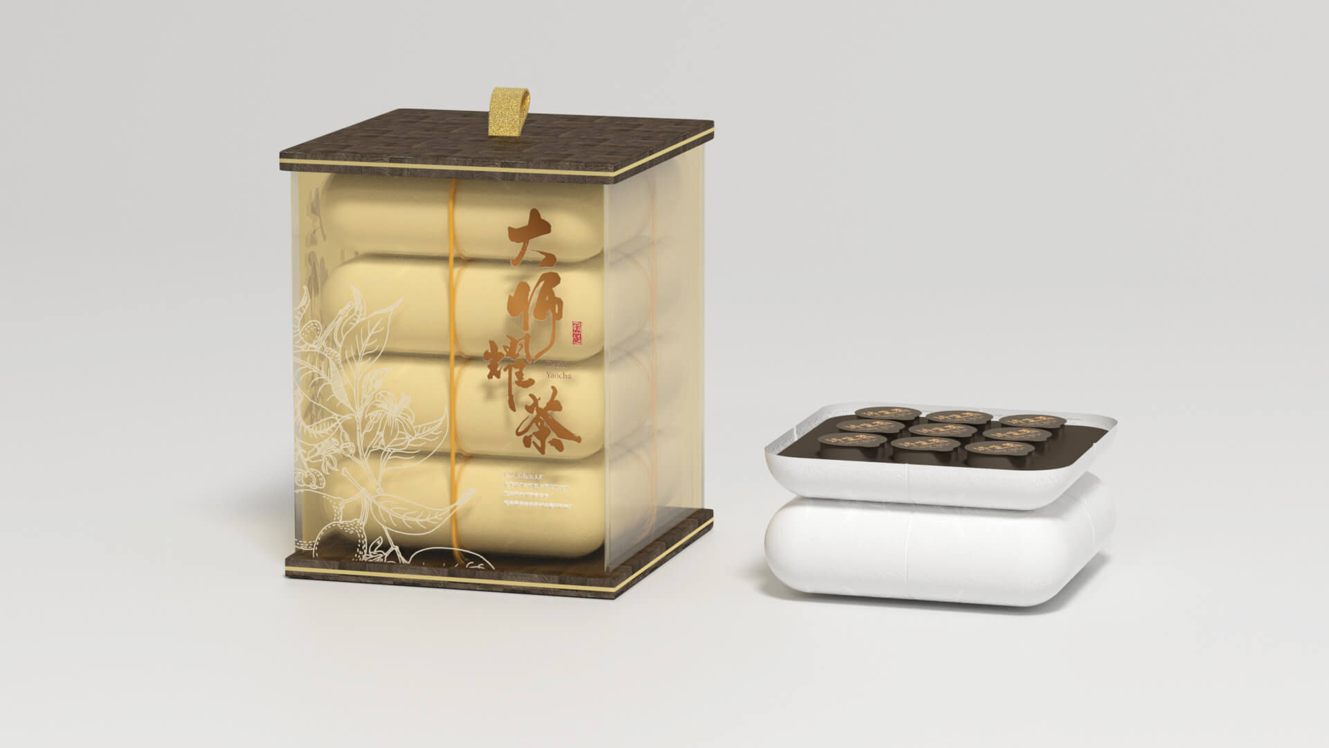 本次设计主要创意来源于传统中药包装,整体采用国潮、大气、简约的设计风格,使消费者对商品产生一种信任感及新鲜感。包装设计中,运用传统工笔画底纹和书法字体,搭配现代几何图案,清晰明了的展现产品内容。整体包装简洁大方,省去传统塑料膜的包装,以“结绳”的方式进行组合,从标签下手,做到包装减量、回收工序减少。盒体采用环保材料制成,后续可作为收纳盒继续使用,体现了中医药企业对“节能低碳”“可持续”模式的逐步探索。此外增加实木上下盖板的PVC外包装盒,盒身采用丝网印及烫金工艺印制企业logo或相应图案,整体透明,配合特种纸手提袋,给人庄重、雅致之感。