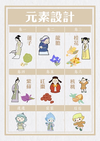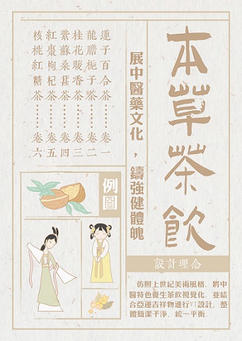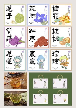 本次设计选取了莲子百合茶、龙胆栀子茶、桂花暖香茶、紫苏桑葚茶、红枣枸杞茶、核桃红糖茶六种寻常本草养生茶,以《神农本草经》、《本草纲目》等为蓝本,将中医特色养生茶饮视觉化,并结合近年亚运吉祥物进行设计,寓健康养生之意。设计仿照上世纪美术风格,以粗细不同的线条表现物体特征,整体画风简洁干净、统一平衡。