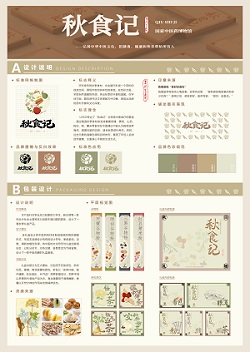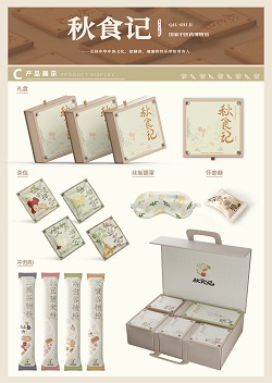 该产品包装风格将中医药食材绘制成版画风格的插图形式,再融入书法字体,形成包装特有的设计符号。并使用柔和、淡雅、清新的暖色色调,将中医的文化符号与礼盒创意相结合,以秋分时节,冷热交替、容易受凉为气候背景,设计了一款中医药膳的礼盒套装。礼盒内部分为五大模块,分别用于存放茶包、速溶饮品、姜糖、真丝眼罩和香包。茶包以“安神补脑、温中健脾、抗压减压、补气血”四种职能划分,四种速溶饮品以养胃的代餐类产品为主。真丝眼罩用于调理睡眠,香囊以开窍宁神的作用来改善精神状态。
